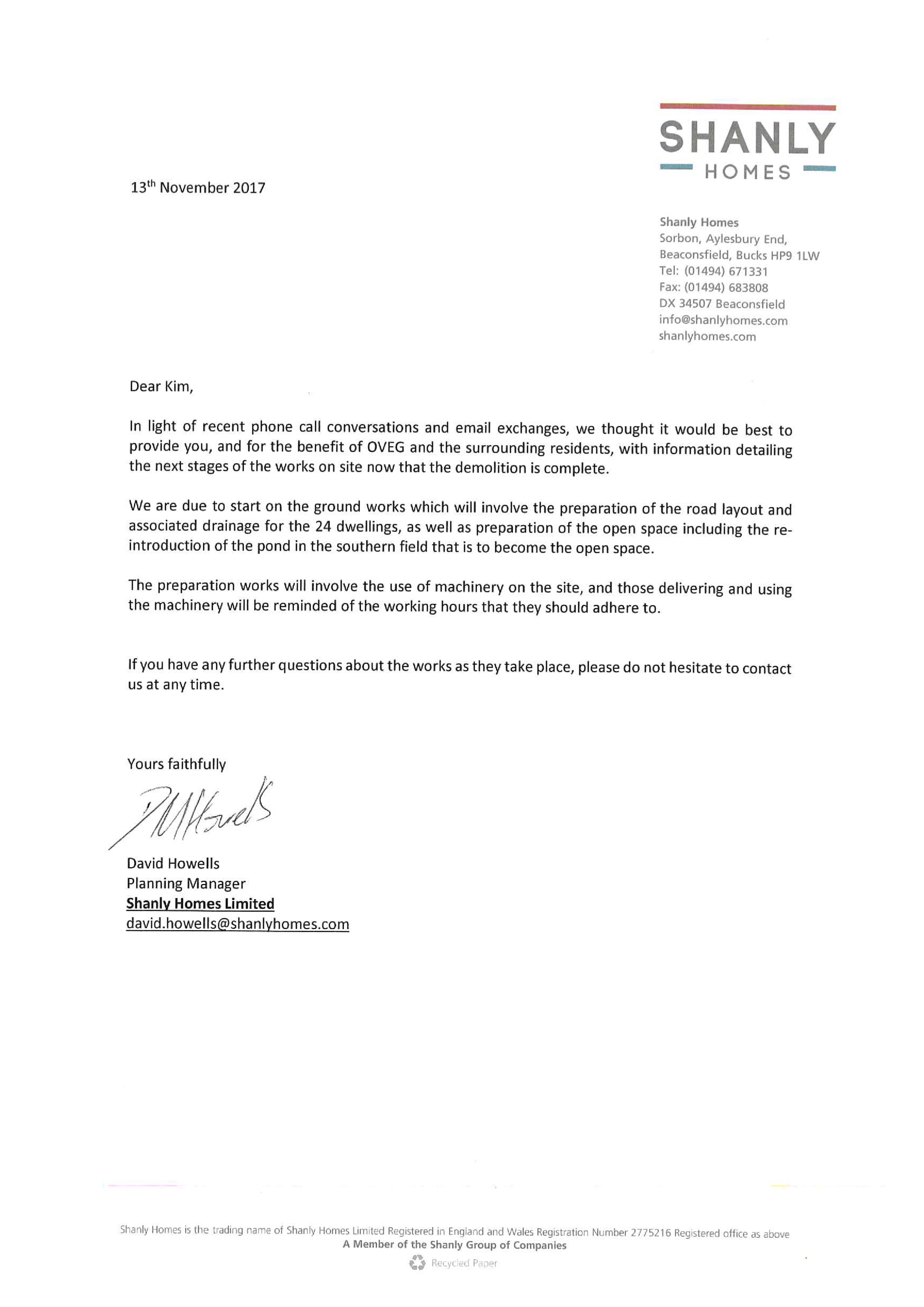 House builder Shanly Homes has written to OVEG about the next phases of work following demolition at Bucks Meadow.