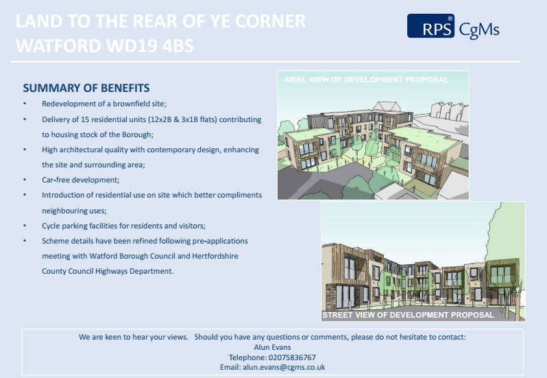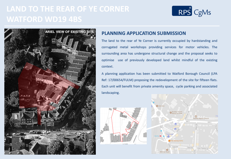 Ye Corner Planning Application July 6, 2017 A planning application has been submitted for 15 residential units at Ye Corner (Aldenham Road/Chalk Hill). You can find out more and have your say by submitting a comment HERE Download this document HERE Share: Click to share on Facebook (Opens in new window) Facebook Click to share on X (Opens in new window) X Click to email a link to a friend (Opens in new window) Email Click to share on WhatsApp (Opens in new window) WhatsApp More Click to print (Opens in new window) Print Click to share on LinkedIn (Opens in new window) LinkedIn Click to share on Pinterest (Opens in new window) Pinterest Click to share on Reddit (Opens in new window) Reddit Click to share on Tumblr (Opens in new window) Tumblr Click to share on Pocket (Opens in new window) Pocket Like this:Like Loading... Related